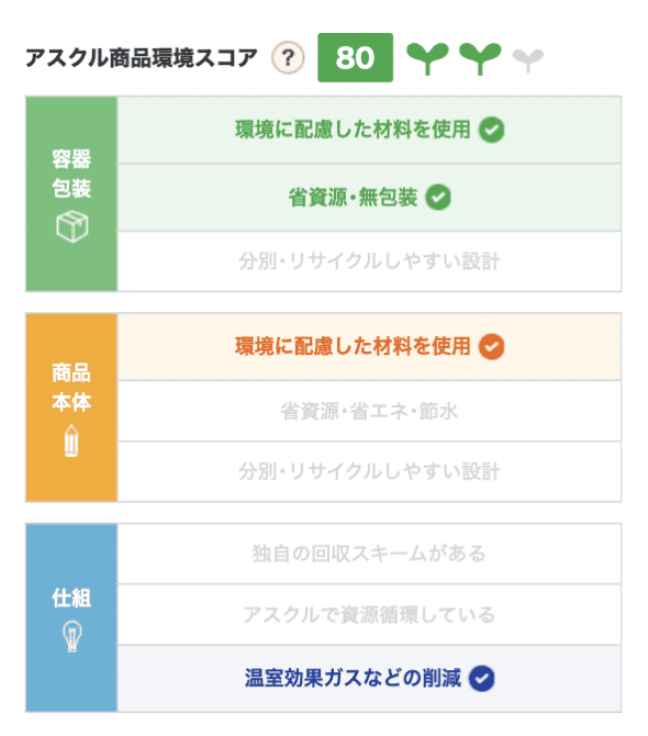 | アスクル商品環境スコア | 80 | アスクル商品環境スコア 詳細加点項目 |
